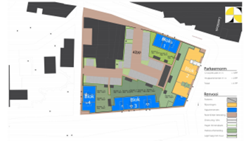 In tegenstelling tot het torenplan, blijft dit nieuwe plan, met haar meer beperkte bouwhoogte, veel beter in harmonie met de bebouwde omgeving. Dit zit niet alleen in het appartementencomplex, maar ook in een aantal grondgebonden woningen, die een eerste, tweede en zolderverdieping krijgen. In het tweede plaatje is de verdeling te zien, waarbij opgemerkt moet worden, dat i.t.t. de legenda de blauwe vlakken de grondgebonden woningen zijn en gele de appartementen.